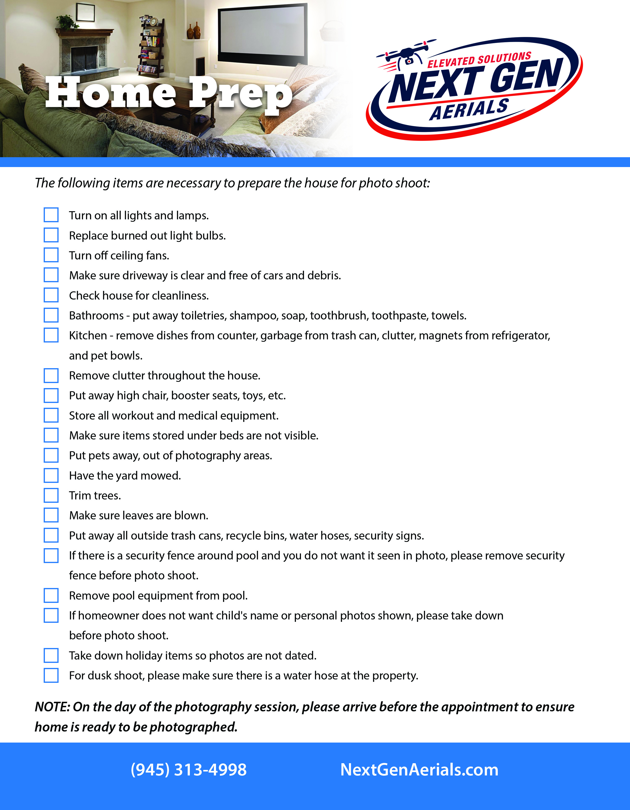 After setting an appointment with Next Gen Aerials LLC, please review the home preparation flyer to ensure your property is ready for the photo shoot. Here you will see all those requirements for photography